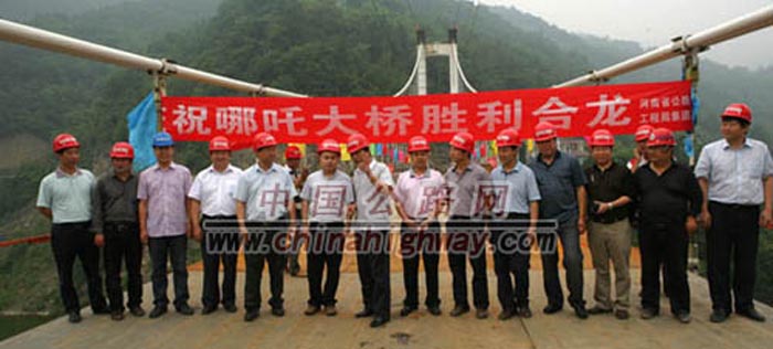 乾元山哪吒大橋設(shè)計(jì)為單跨252米懸索結(jié)構(gòu)特大橋。不僅跨徑較大、工藝復(fù)雜、施工條件苦、安全要求高,而且有效建設(shè)工期僅有短短8個(gè)月。河南省公路工程局集團(tuán)受命承接這項(xiàng)艱巨而光榮的援建任務(wù)后,按照省交通運(yùn)輸廳“生產(chǎn)零事故、質(zhì)量零缺陷、項(xiàng)目零利潤、廉政零違紀(jì)”的總體要求,迅速抽調(diào)精兵強(qiáng)將,立即進(jìn)場,科學(xué)部署施工。經(jīng)理部結(jié)合工程實(shí)際情況,將整體工程分為索塔、隧道錨、主索和鋼桁梁四大塊組織實(shí)施。其中大橋兩岸錨碇、索塔同步平行施工,并在通口河兩岸分別設(shè)砼拌合站,主纜、吊桿、索鞍、索夾及鋼梁等構(gòu)件在工廠內(nèi)加工制作。由于采取了科學(xué)得力的施工管理措施,克服了災(zāi)后交通阻塞、橋位場地狹窄、設(shè)計(jì)方案多次調(diào)整等不利因素制約,始終維持著項(xiàng)目建設(shè)的良好態(tài)勢,強(qiáng)力推動著大橋施工順利進(jìn)展,受到了川豫兩省主管領(lǐng)導(dǎo)和當(dāng)?shù)厝嗣袢罕姷囊恢路Q道。河南省公路工程局集團(tuán)全體援建人員,以實(shí)際行動再次向川豫兩省人民昭示了“團(tuán)結(jié)、拼搏、科學(xué)、卓越”的河南交通建設(shè)鐵軍精神。